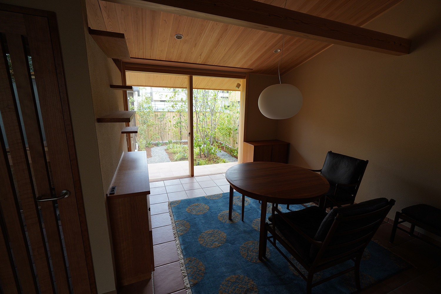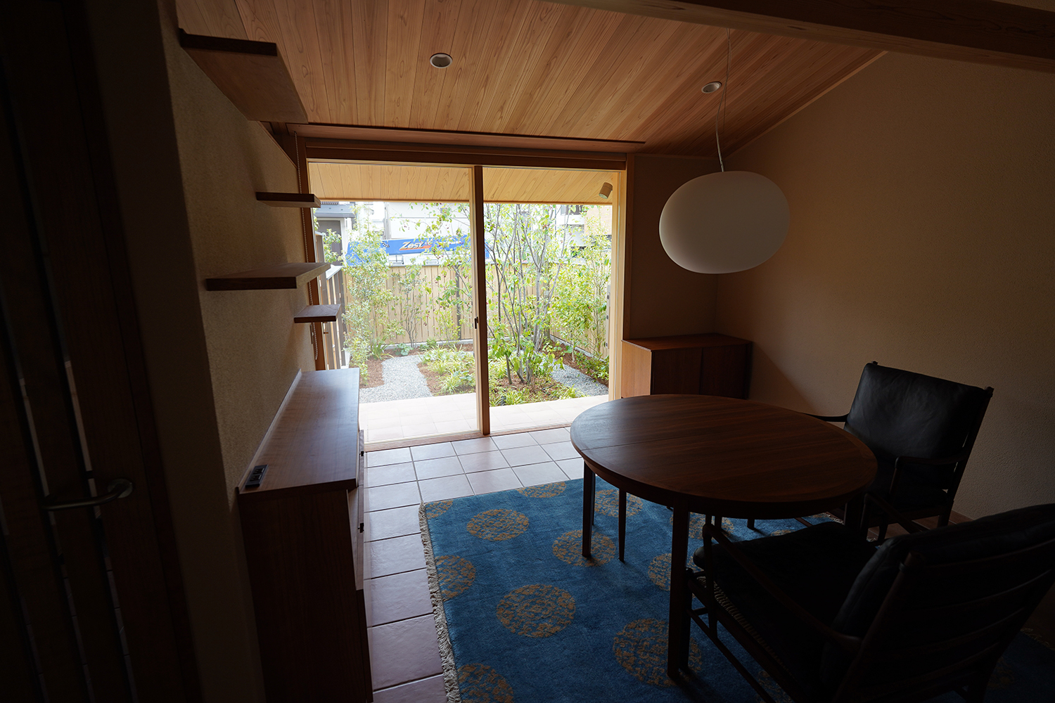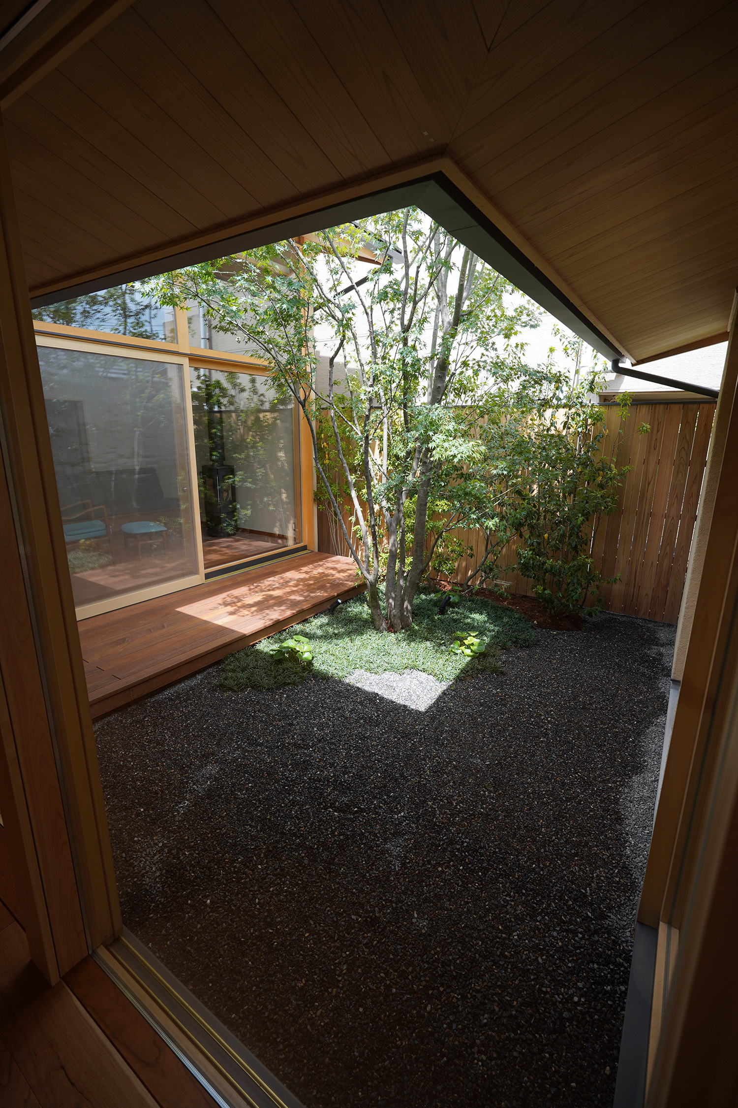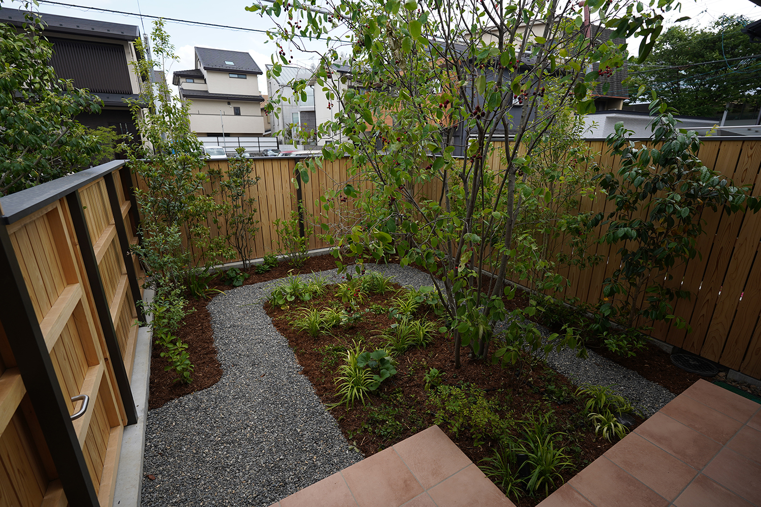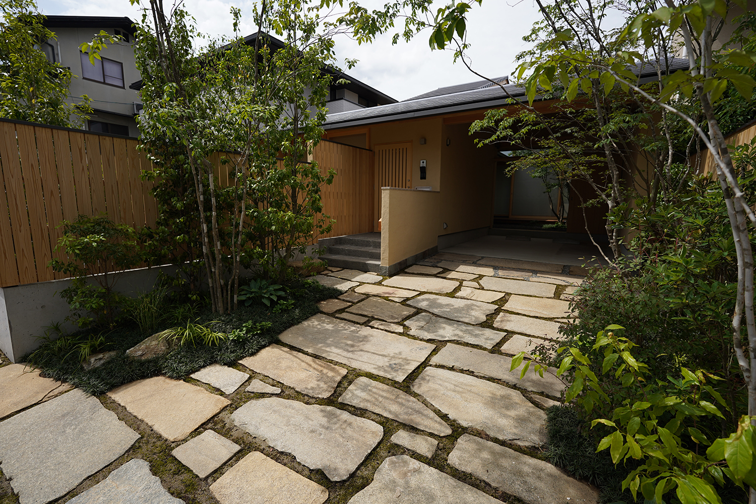 アプローチの古材石敷、植栽を施工。中庭のモミジは夏に木陰を作るという設計趣旨に応じ搬入できるぎりぎりの大きさの物を選定し植栽した。緑豊かな前庭は地域に開き、街角に貢献しているように思う。