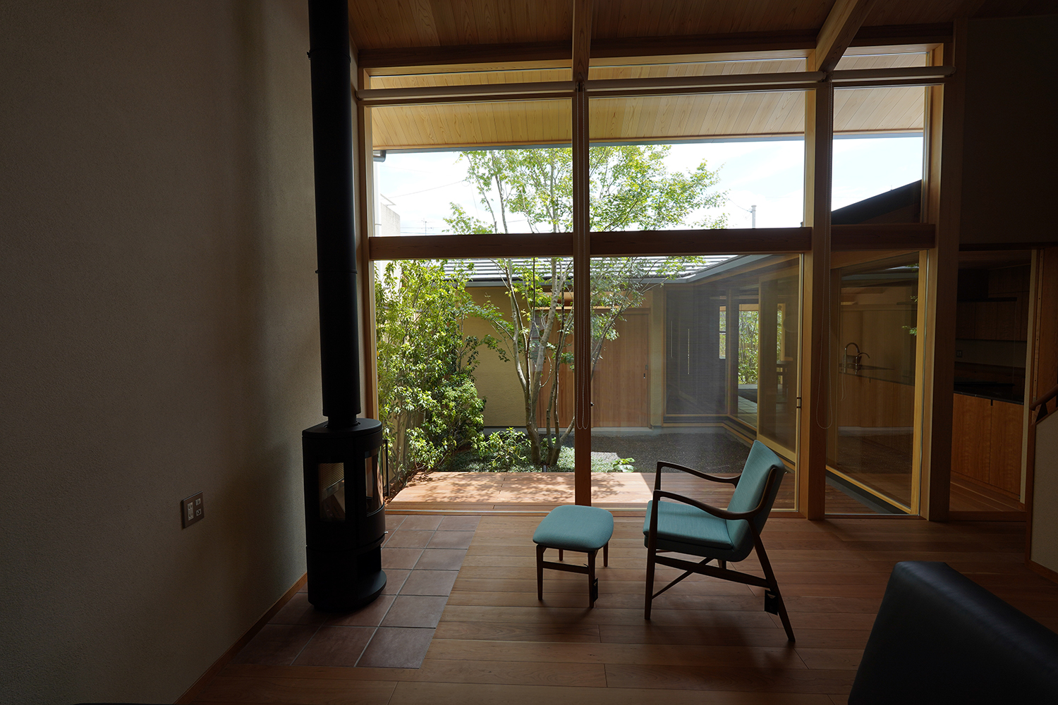 京都市北部の住宅地に立つ半中庭型の住宅。