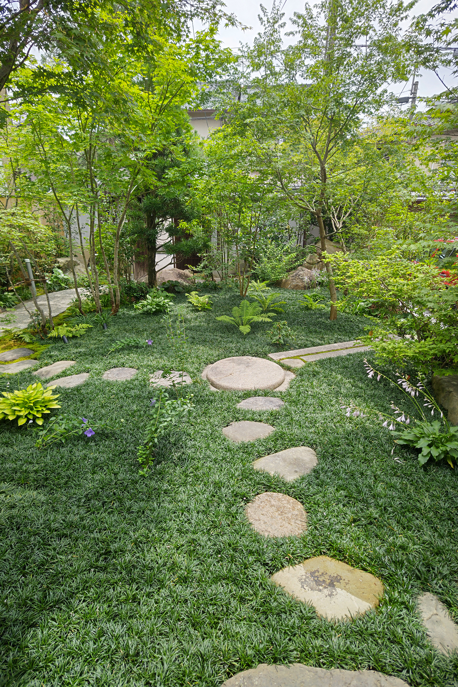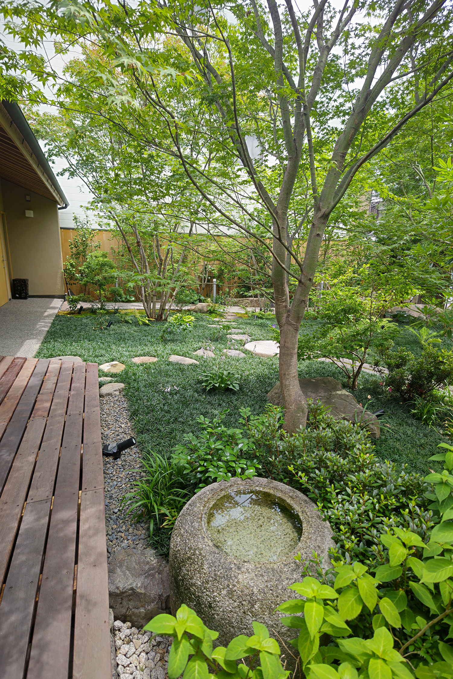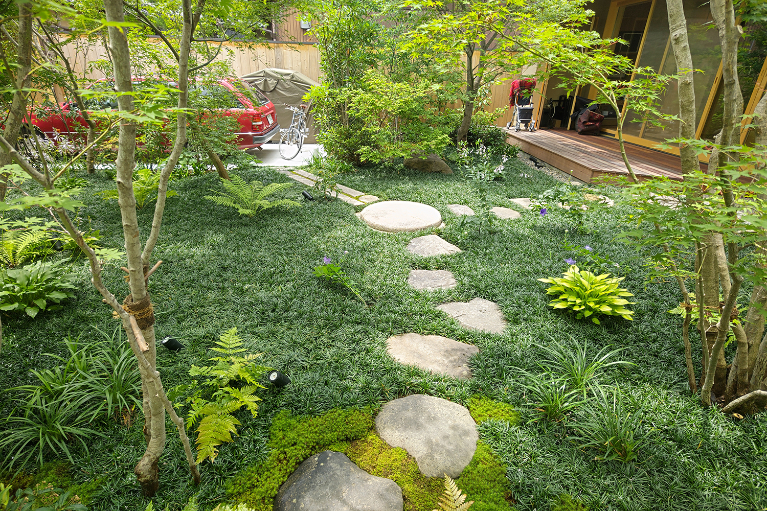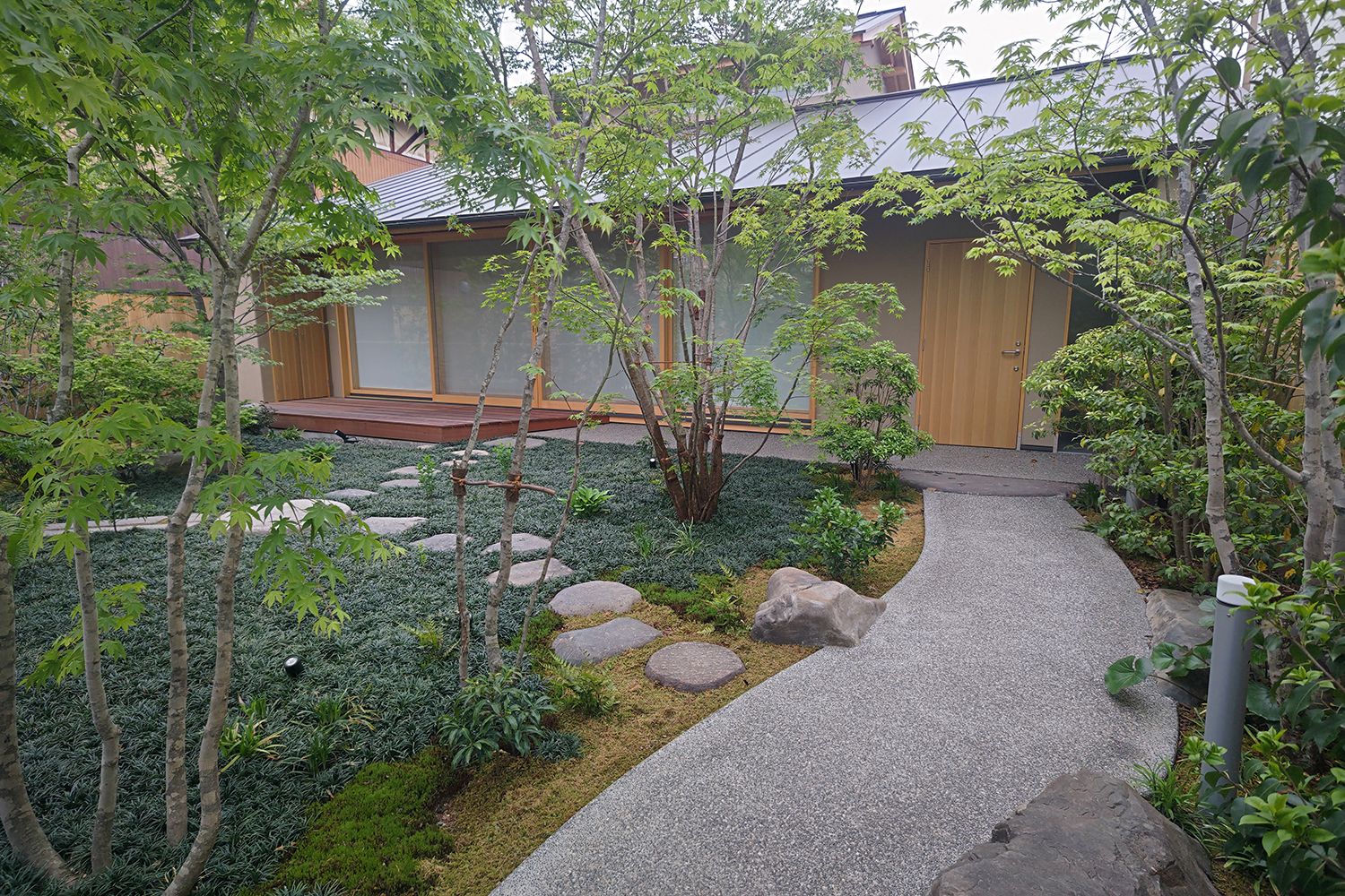 住宅規模に対して庭が広く、元からあるマツやマキに加えヤマモミジやイロハモミジをふんだんに植栽した。元からあった庭石も全て使用し緑豊かな趣のある空間となった。