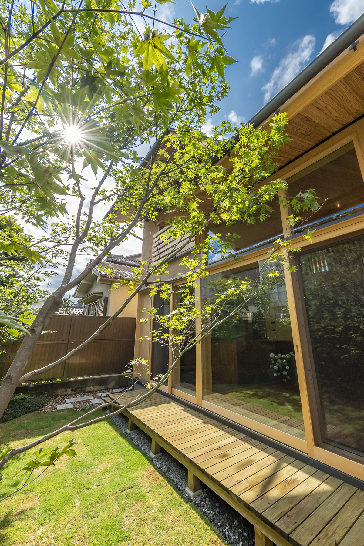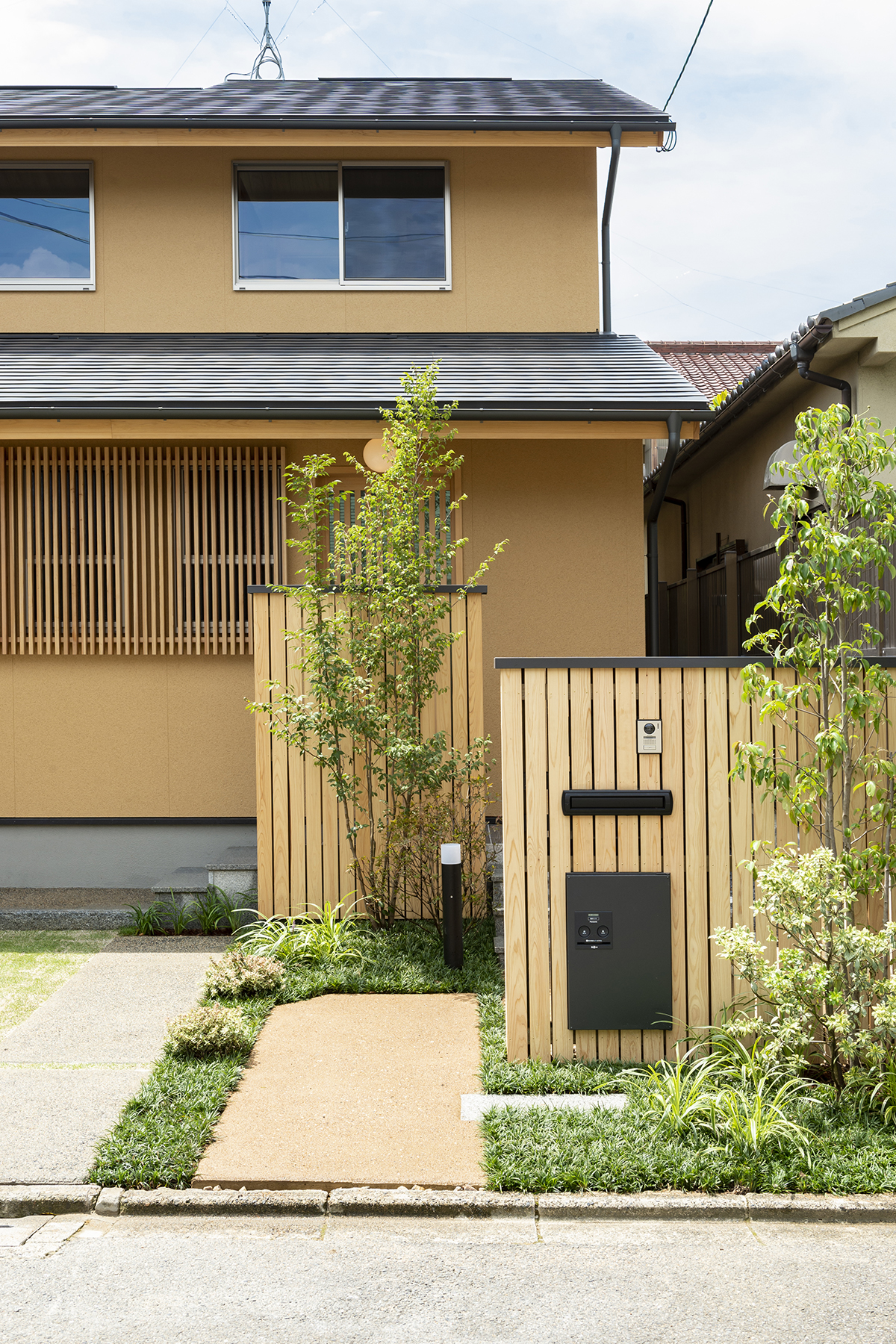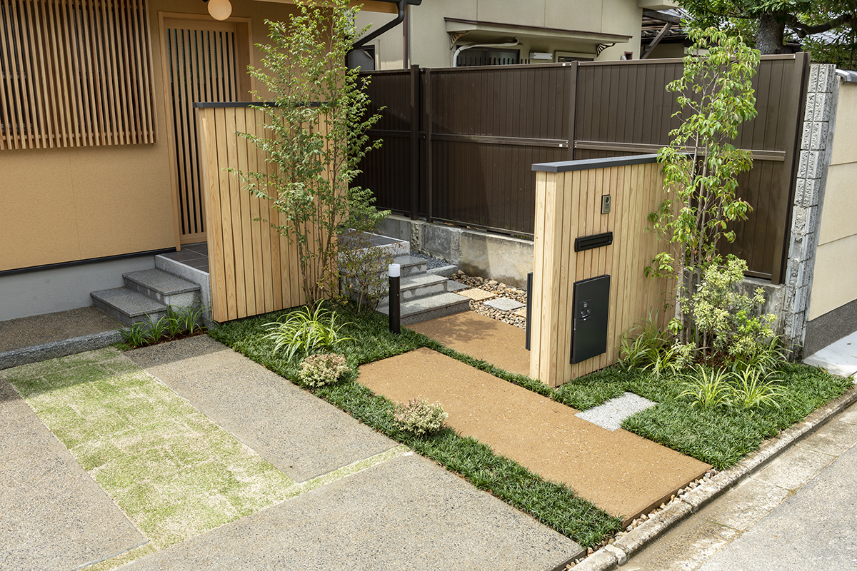住宅北側は門扉、アプローチ、駐車場などを計画し、南面にはリビングに付随する主庭を設けた。門扉には郵便受け、宅配ボックス、照明などの機能をもたせつつ、閉鎖的にならないように配置、アプローチは真砂土洗出しとし柔らかな雰囲気となる事を狙った。南側の主庭は常緑樹で背景を作り主木となるヤマモミジをリビング脇に配した。また暖炉で使用する薪を保管する薪棚の製作もおこなった。